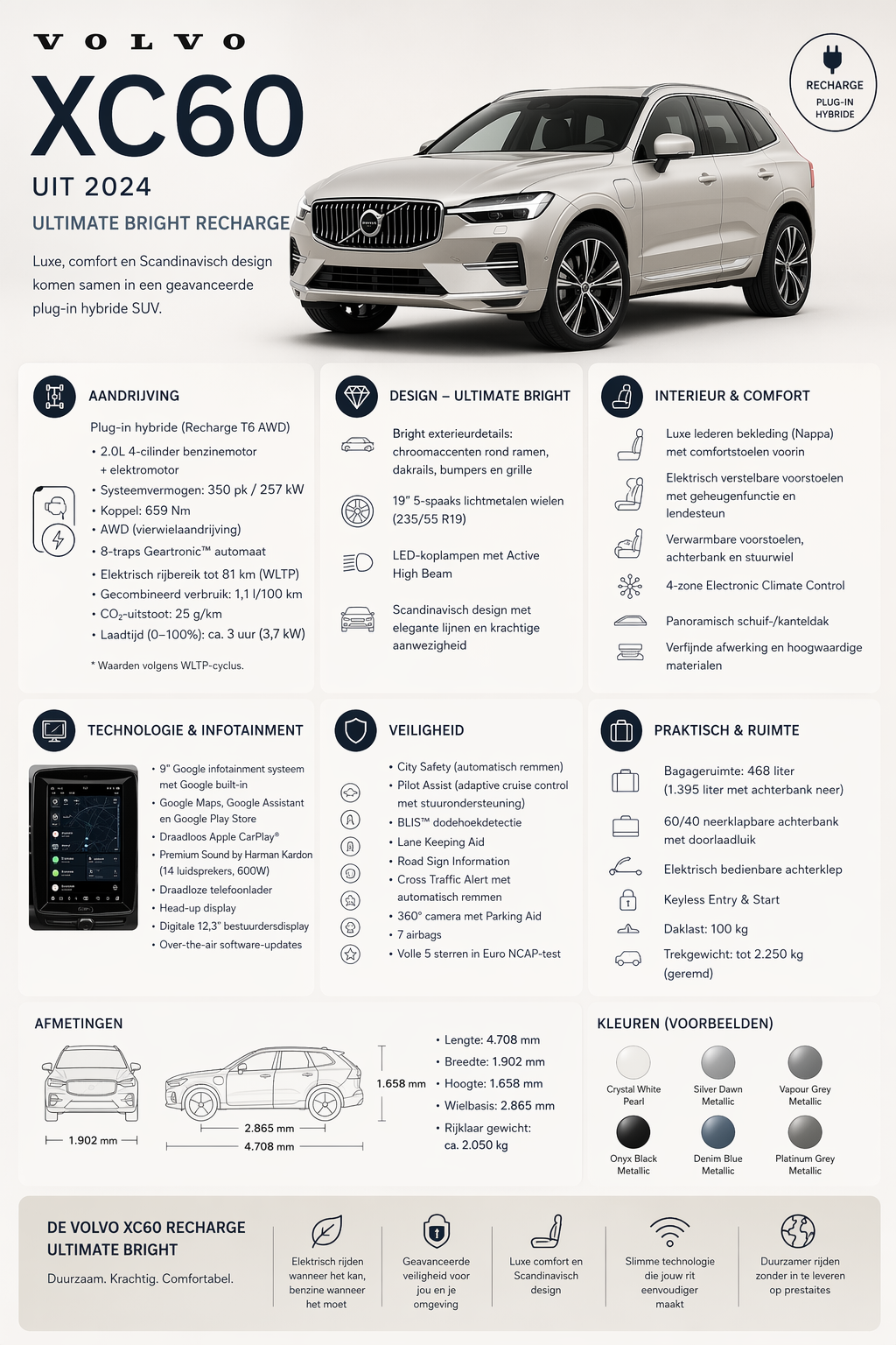 PROMPT: Maak een infographic van de eigenschappen van de Volvo XC60 uit 2024 Ultimate Bright Recharge